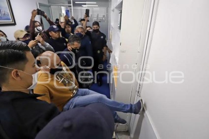 PUEBLA, Pue. 02 Junio 2020.- Elementos de la policía estatal desalojan a Jorge Alberto Paniagua, coordinador de despliegue territorial, de las instalaciones de la policía estatal. //Hilda Ríos/Agencia Enfoque//