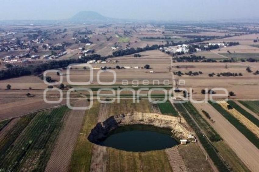 SANTA MARÍA ZACATEPEC, Pue. 20 Mayo 2022.- Vista aérea del socavón de Zacatepec, Puebla. A casi un año de su formación el área sigue restringida por una cerca, los comercios que surgieron se encuentran cerrados y no se observan turistas. //Pablo Spencer/Agencia Enfoque//