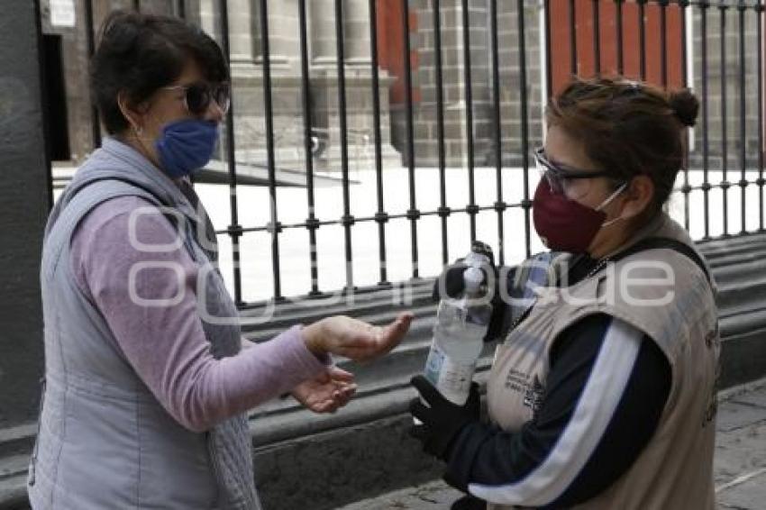 PUEBLA, Pue. 9 Agosto 2020.- Reparto de gel antibacterial por personal del Ayuntamiento ante la concentración de familias que asisten al Centro Histórico, luego de iniciar la reapertura parcial de comercio. //Rafael Pacheco/Agencia Enfoque//