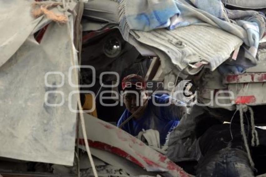 PUEBLA, Pue. 10 Junio 2024.- Cuerpos de emergencia realizaron el rescate del cadáver del conductor de un tráiler, quien murió al impactarse contra un pilar del segundo piso de la autopista México-Puebla, a la altura de La María. //Mireya Novo/Agencia Enfoque//