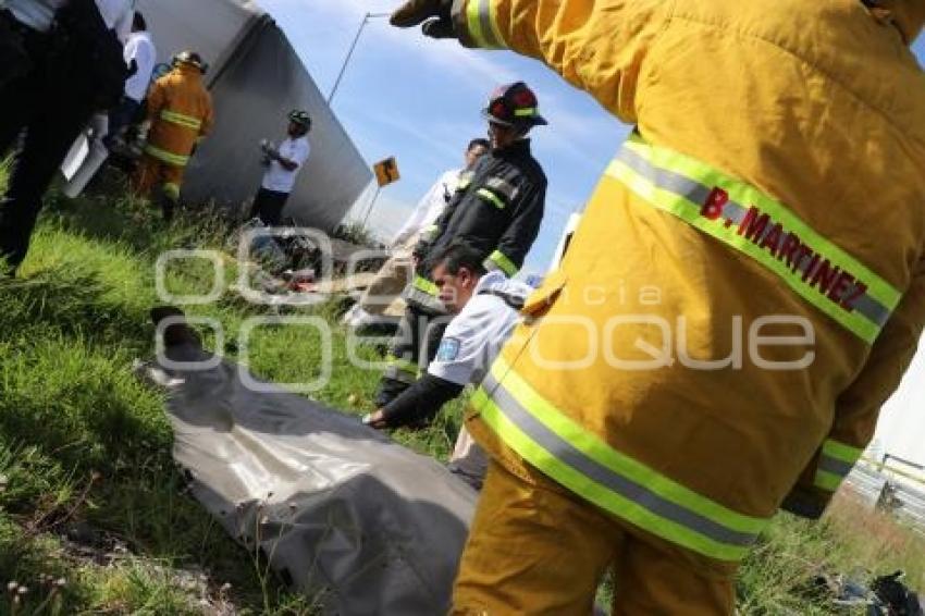 PUEBLA, Pue. 21 septiembre 2018.- El chofer de 28 años que conducía tractocamión, murió tras la volcadura que sufrió, se dirigía al parque industrial La Resurrección. Los hechos ocurrieron sobre la incorporación a Vía corta a Santa Ana en la Autopista México-Puebla. //Agencia Enfoque//