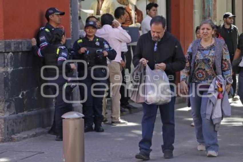 PUEBLA, Pue. 05 Noviembre 2023.- Elementos de la Policía Municipal permanecen en distintos puntos de las avenidas 8 y 10 Poniente del Centro Histórico de Puebla para evitar la instalación de ambulantes en la zona. //Mara González/Agencia Enfoque//
