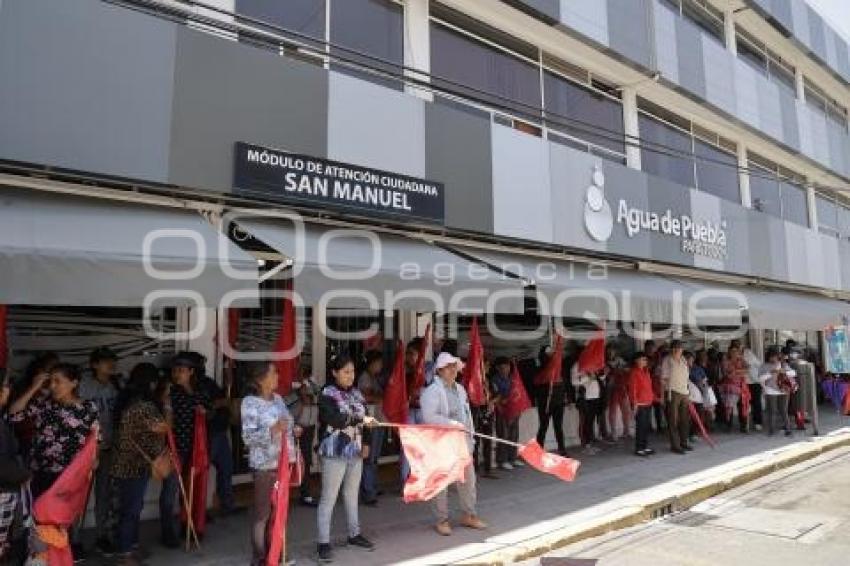 PUEBLA, Pue. 20 junio 2023.- Manifestantes protestan frente a Agua de Puebla para exigir el suministro de agua potable y pipas en la zona de La Resurrección, Xonacatepec y Clavijero. //Imelda Medina/Agencia Enfoque//