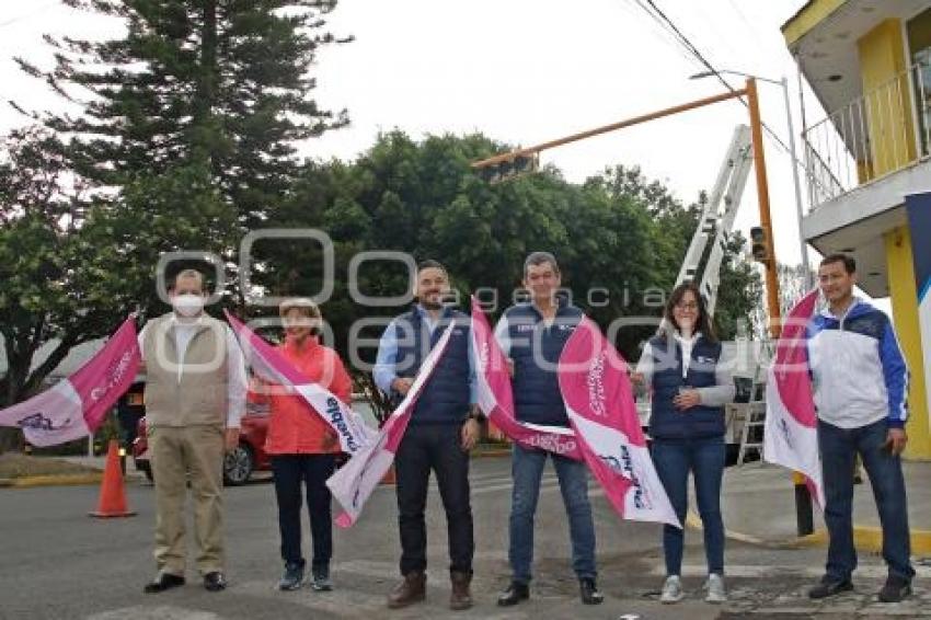 PUEBLA, Pue. 16 Junio 2022.- El regidor, Carlos Montiel y el gerente municipal, Adán Domínguez Sánchez, presentan el banderazo de retiro de infraestructura semafórica desde la Avenida Circunvalación y Río Mayo, San Manuel. //Mara González/Agencia Enfoque//