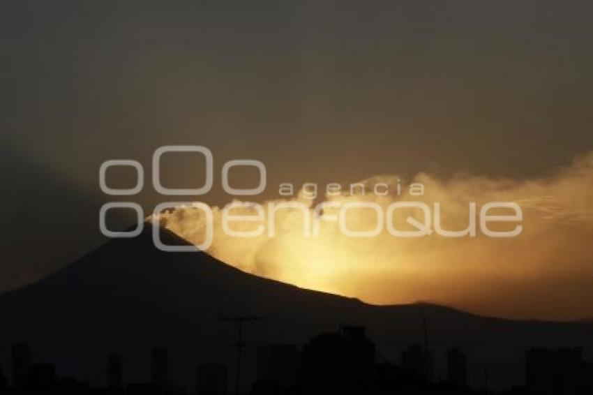 ATARDECER PUEBLA, Pue. 06 Abril 2023.- El sol se oculta tras el volcán Popocatépetl al atardecer en la ciudad de Puebla. // Pablo Spencer/Agencia Enfoque // Agregar a Carrito Comprar