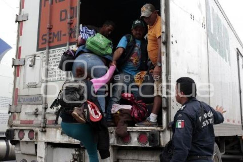 CARAVANA MIGRANTE PUEBLA, Pue., 04 Noviembre 2018.- Integrantes de la Caravana Migrante van rumbo a la CDMX en vagones de trailer sobre la autopista Puebla - México. //Mireya Novo/Agencia Enfoque// Agregar a Carrito Comprar
