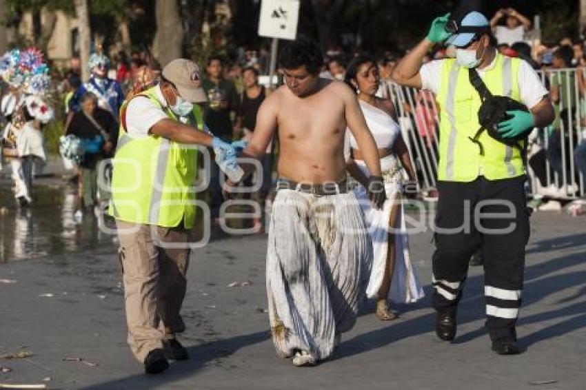 SAN PEDRO CHOLULA, Pue., 14 Febrero 2016.- Cientos de carnavaleros participan en el tradicional Carnaval de San Pedro Cholula. En la imagen: un carnavalero es atendido por paramédicos luego de sufrir quemaduras durante la detonación de un mosquetón. //Francisco Guasco/Agencia Enfoque//